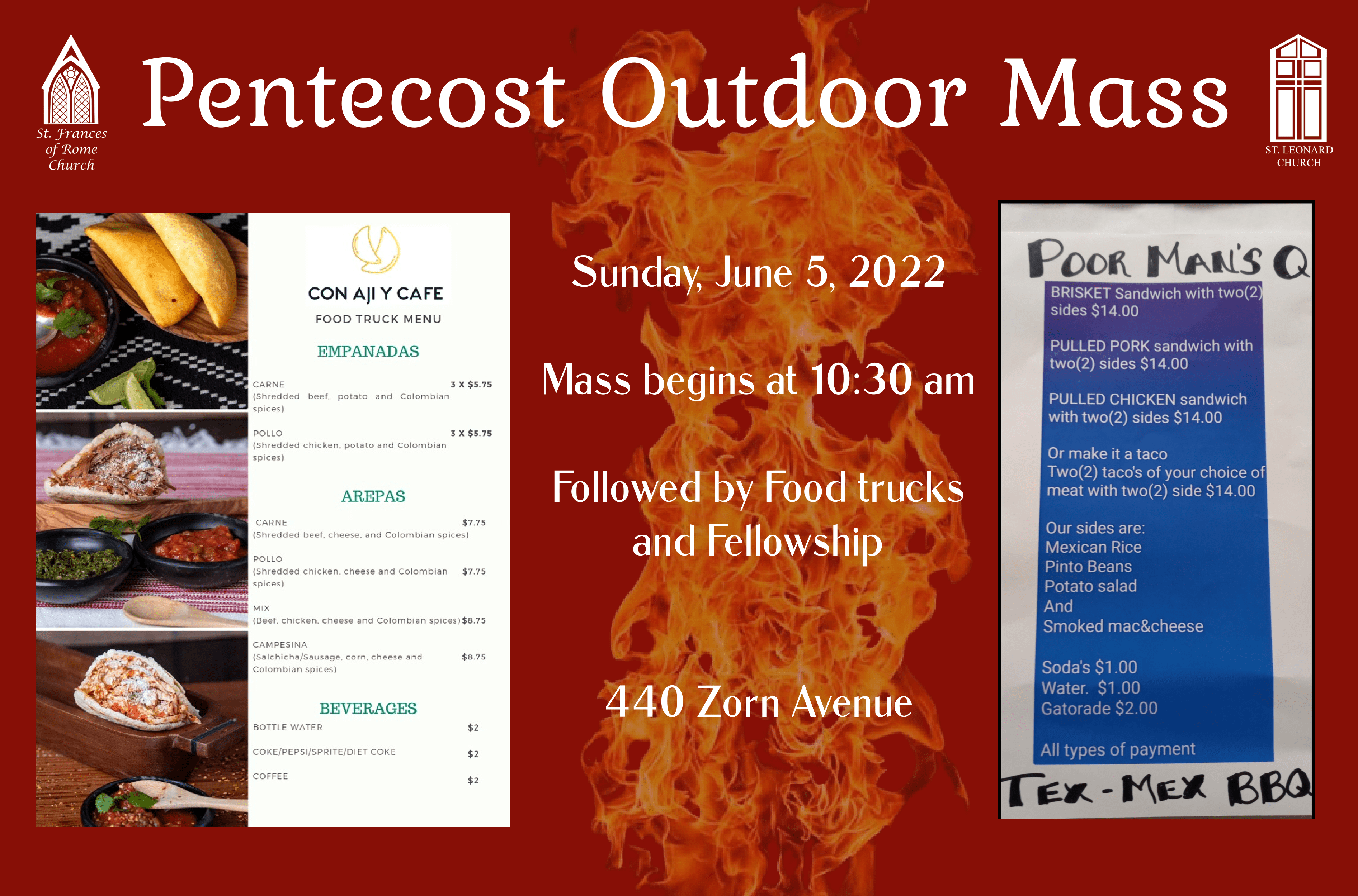 Join us this Sunday, June 5th for our Outdoor Pentecost Mass at St. Leonard! Mass begins at 10:30am followed by food trucks and fellowship! Con Aji Y Cafe and Poor …