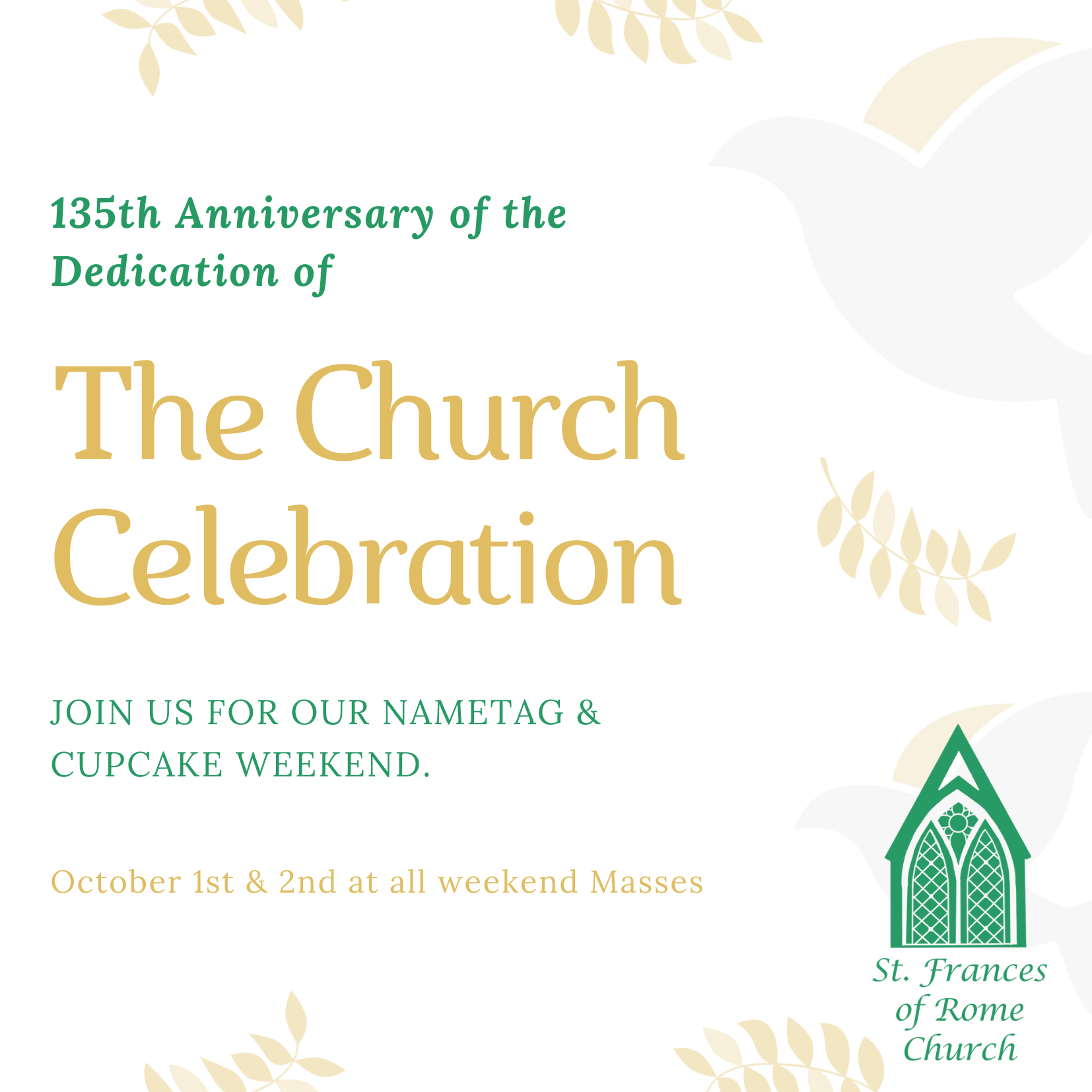 The St. Francis of Rome Welcoming/New Member Committee will be hosting Our 135th Anniversary of the Dedication of the Church Celebration with/ Nametag and Cupcake Weekend! Saturday and Sunday, October …