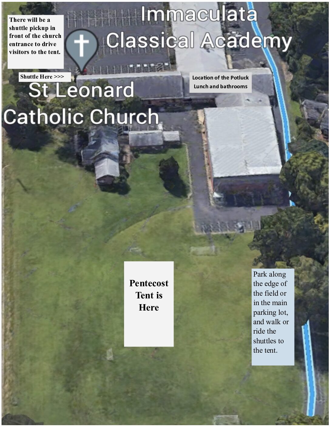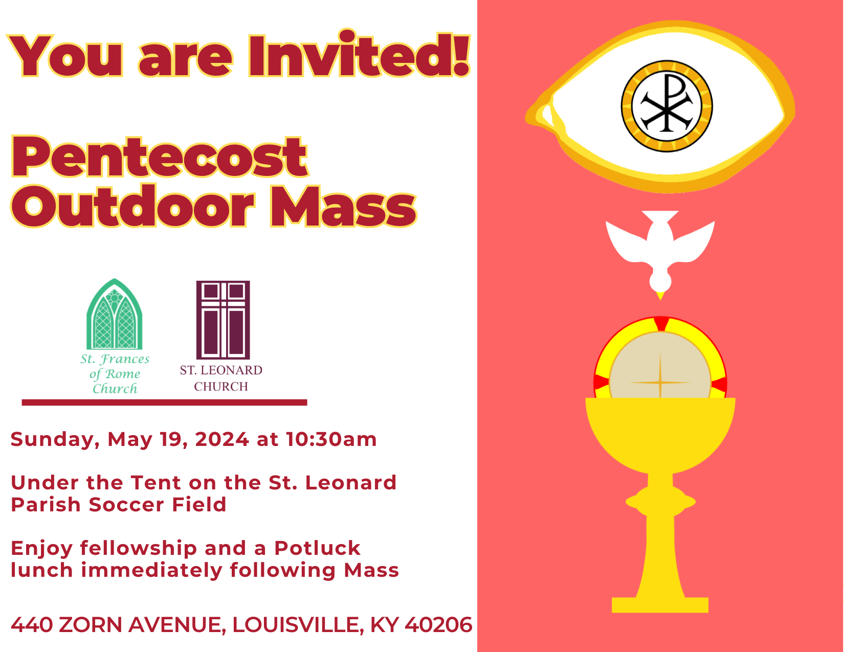 We can’t wait to see you this Sunday morning at 10:30am on the St. Leonard Soccer Field for our outdoor Pentecost Mass and Potluck Lunch to follow. Parking is available …