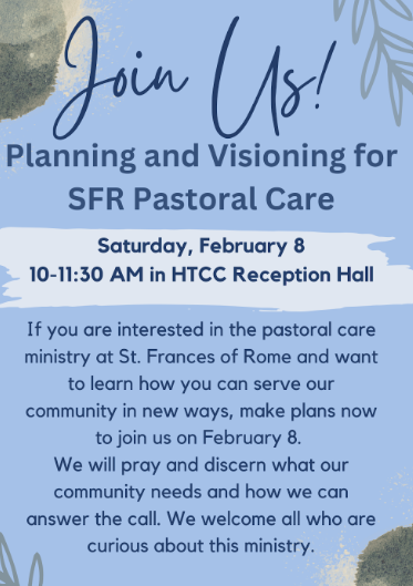 Please consider attending the Planning and Visioning session that the pastoral care ministries team will hold on Saturday, February 8 from 10-11:30 am in the Holy Trinity Clifton Campus Reception …