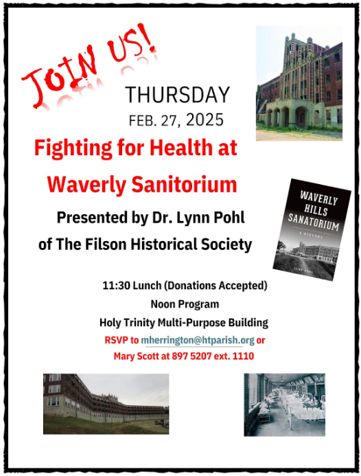 Join Seniors on Thursday, February 27 at Holy Trinity to learn more about Waverly Hills Sanitorium from Dr. Lynn Pohl Program starts with lunch at 11:30am (donations accepted). The event will be …