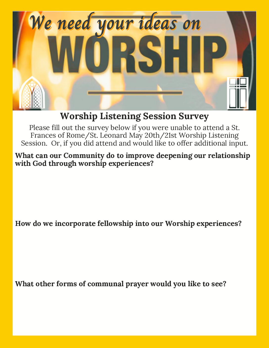 We want to hear from you. Please fill out the survey below if you were unable to attend a St Frances of Rome/ St. Leonard May 20th/21st Worship Listening Session, …