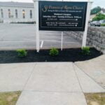 This week’s landscaping update shows some very nice progress around the campus. Luv-it! Landscaping came by and began the transfer of the existing liriope plantings along the backside of the Parish House to other parts of the campus. The plantings are in great shape and rather than remove and dispose of them, the decision was made to use them and save some costs on the project. Using this ground cover along Fr Lou’s and Sharon’s offices will eliminate the “dust bowl” we would have in the summertime where the shade of the trees kills a lot of the grass in that area. Stay tuned for more updates each week.